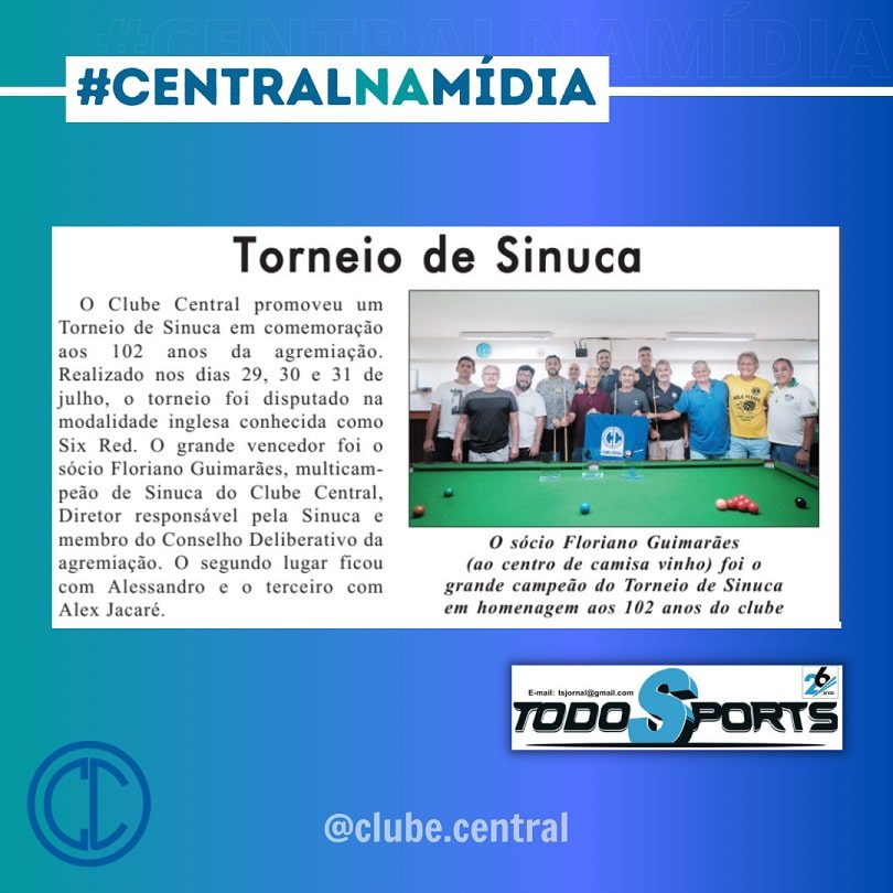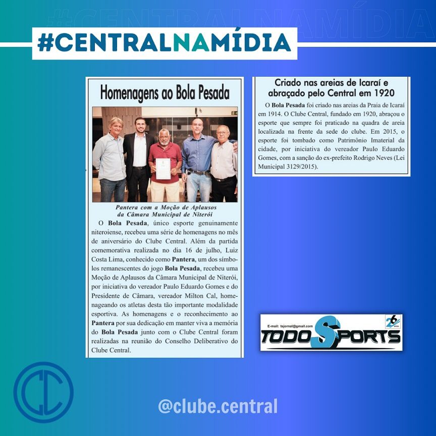 A edição também noticiou o nosso Torneio de Sinuca, promovido em comemoração aos 102 anos do Clube Central e as homenagens prestadas ao Bola Pesada, esporte genuinamente niteroiense que abraçamos desde a nossa fundação
