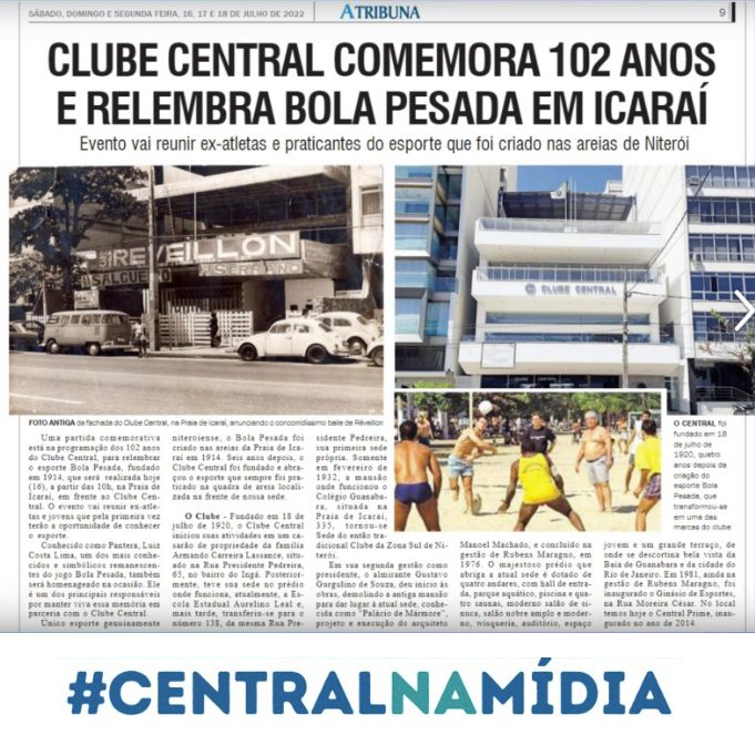 O Jornal A Tribuna publicou matéria sobre as homenagens do Clube Central ao esporte Bola Pesada, com uma partida comemorativa realizada no dia 16 de julho, na Praia de Icaraí, em frente ao Clube Central.