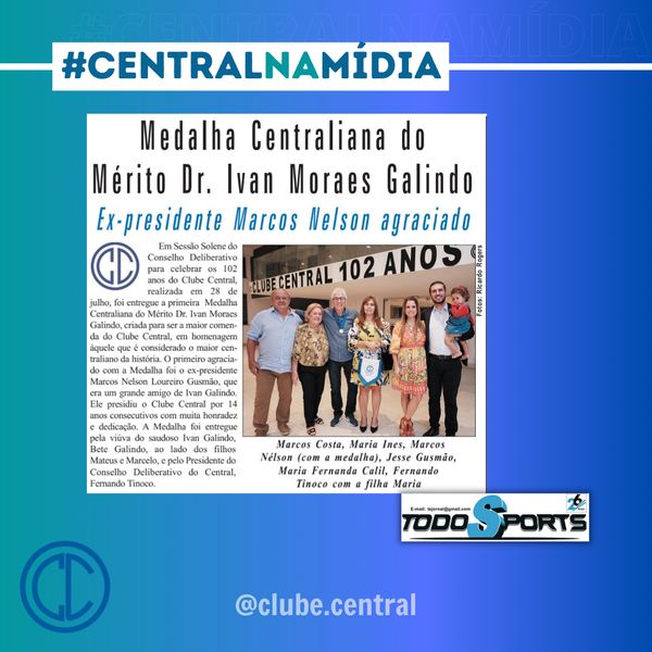 A edição de agosto do jornal Todo Sports pautou a entrega da primeira Medalha Centralina do Mérito Dr. Ivan Moraes Galindo, que teve como primeiro agraciado o ex-presidente Marcos Nelson Loureiro Gusmão.