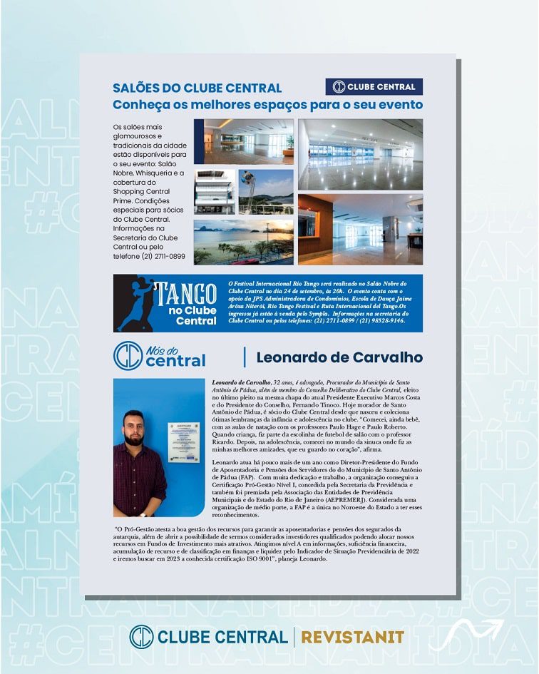 A edição de setembro da Revista Nit (@revista.nit) destacou os maravilhosos salões do Clube Central disponíveis para locação. A revista também trouxe uma nota sobre a realização do Festival Internacional Rio Tango, no Clube Central, além da coluna Nós do Central.